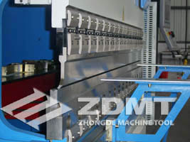 本系列液壓折彎機(jī)是雙缸上動(dòng)式的數(shù)控液壓折彎機(jī),它通過伺服比例閥上的各類閥門動(dòng)作來驅(qū)動(dòng)左右油缸的伸長與返回,從而帶動(dòng)滑塊的上升與下降。滑塊的同步采用全閉環(huán)電液伺服控制技術(shù),滑塊位置信號由兩側(cè)光柵尺反饋給數(shù)控系統(tǒng),再由數(shù)控系統(tǒng)控制同步閥的開口大小,自動(dòng)調(diào)節(jié)油缸進(jìn)油量的多少,從而控制滑塊(Y1、Y2)軸的同步運(yùn)行,始終保持對工作臺的平行狀態(tài)。
