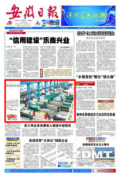 今日(2009年11月11日)《安徽日報》頭版刊載《博望機床銷四方》的圖片新聞報道。在我公司大型車間圖片中,配出如下文字報道:11月6日,位于當涂縣博望鎮的民營企業安徽中德機床股份有限公司生產車間里一片繁忙。該企業今年前三季度銷售量同比增長35%,產品出口30多個國家和地區。(特約攝影 謝富樂)
